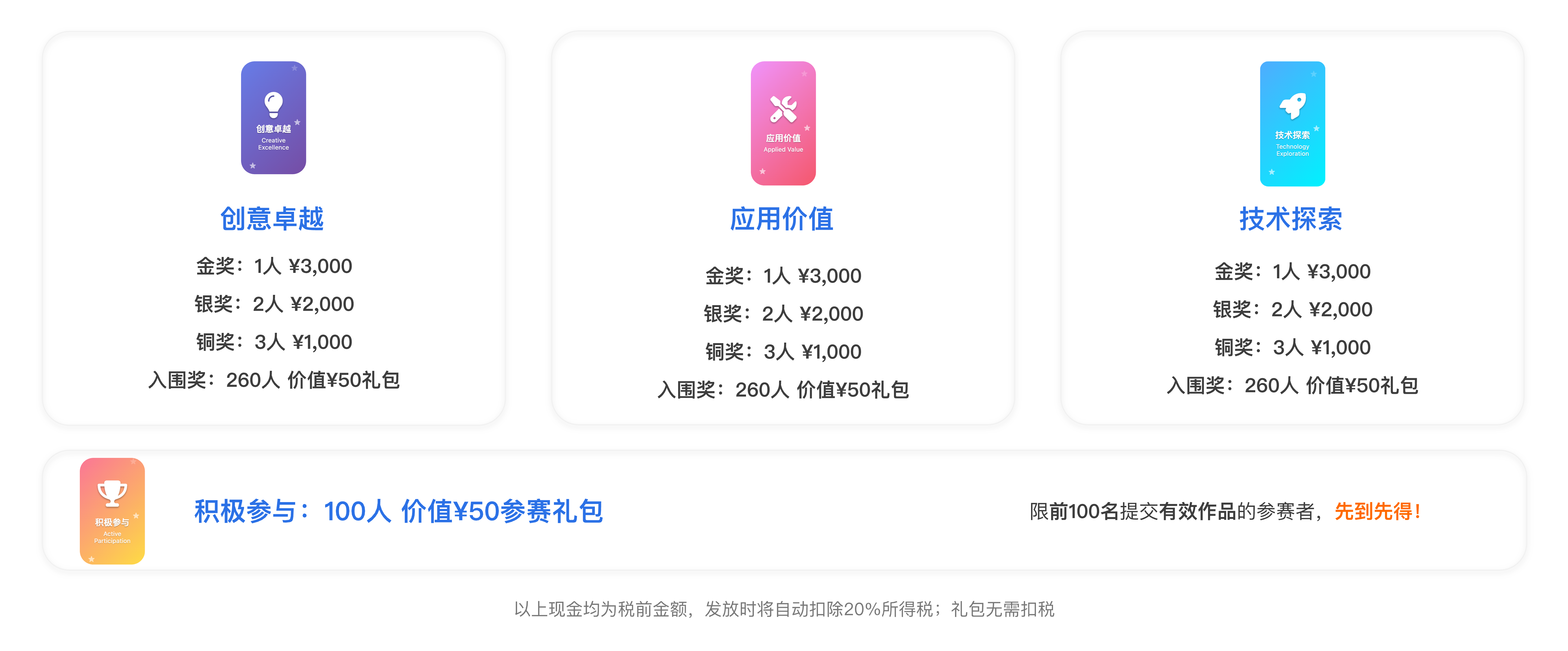 本次大赛奖金池总额为100000元,作品打榜奖金激励共计74000元,作品打榜激励奖设置如下: