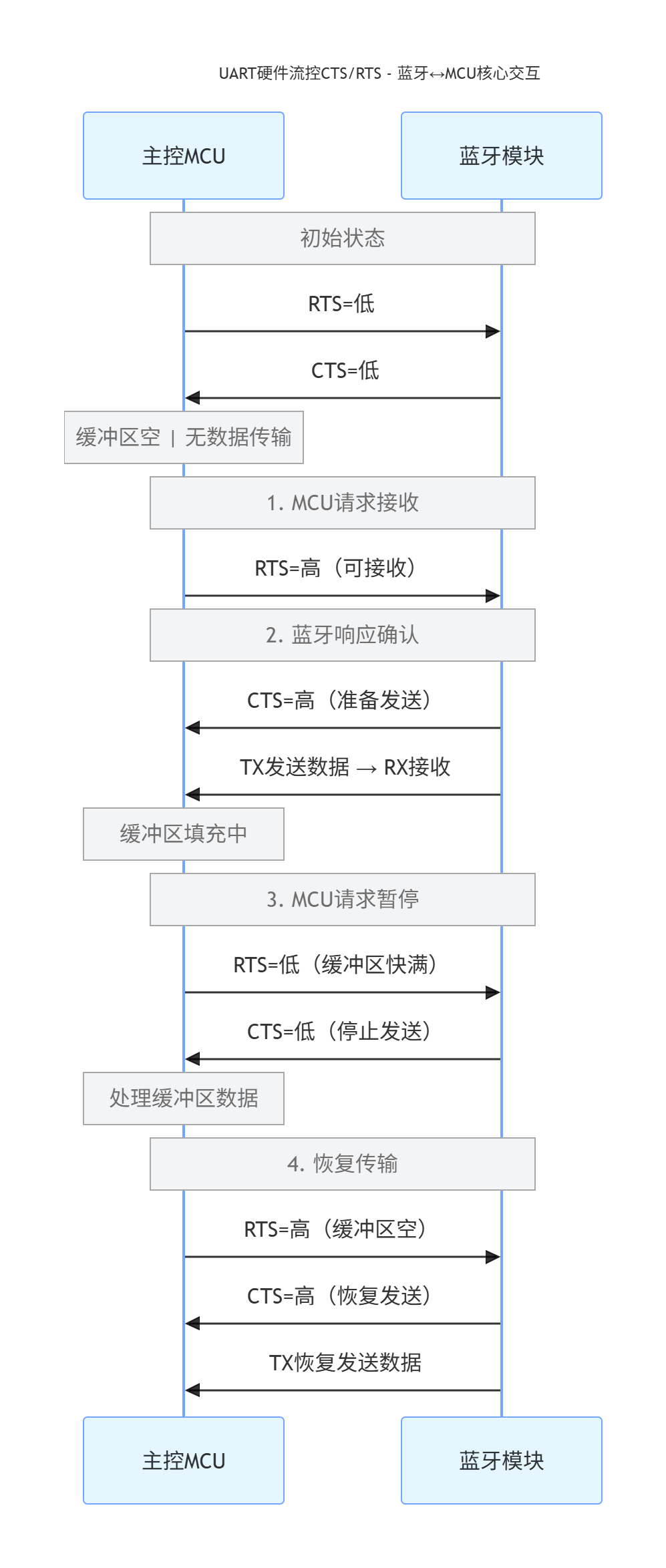 1. 初始状态:蓝牙模块和MCU的RTS、CTS均为低电平,双方处于“待命”状态,MCU的UART接收缓冲区为空。