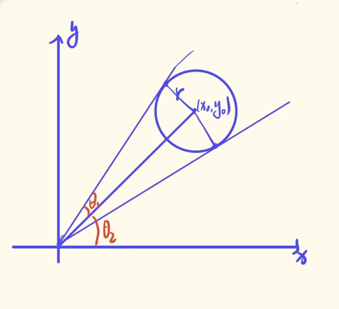 • 一个地雷与从原来的射线的范围为\([\theta_2-\theta_1, \theta_2+ \theta_1]\)