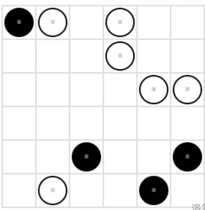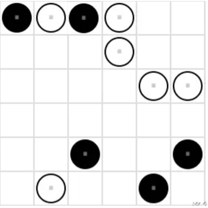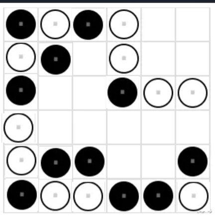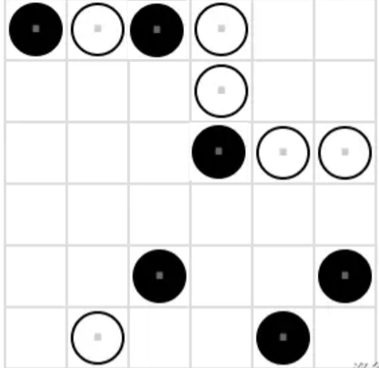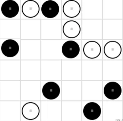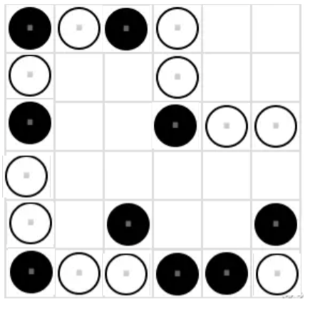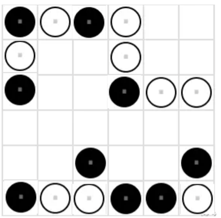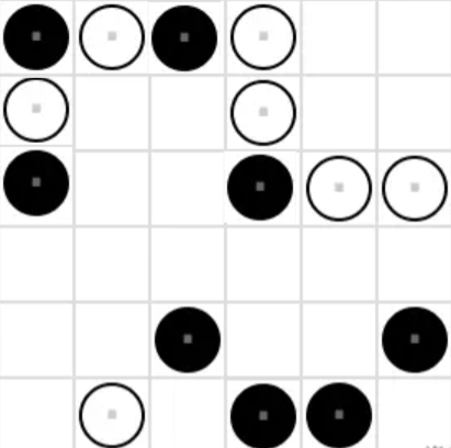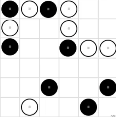 • \((6, 3)\)\((6, 6)\)位置填黑棋会违反相邻棋子限制,因此填白棋。根据行列棋子数相同,6 行可以填完。